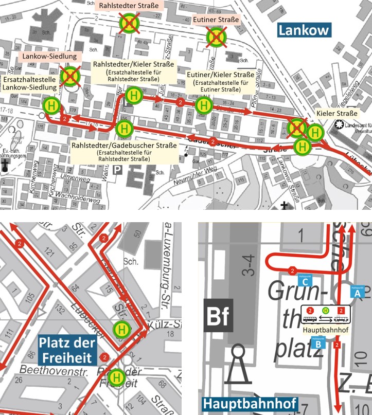 Die Linie 2 fährt wie die Linie 1 nach Kliniken. Zwischen Hauptbahnhof und Lankow-Siedlung wird ein Ersatzverkehr mit Bussen eingerichtet.